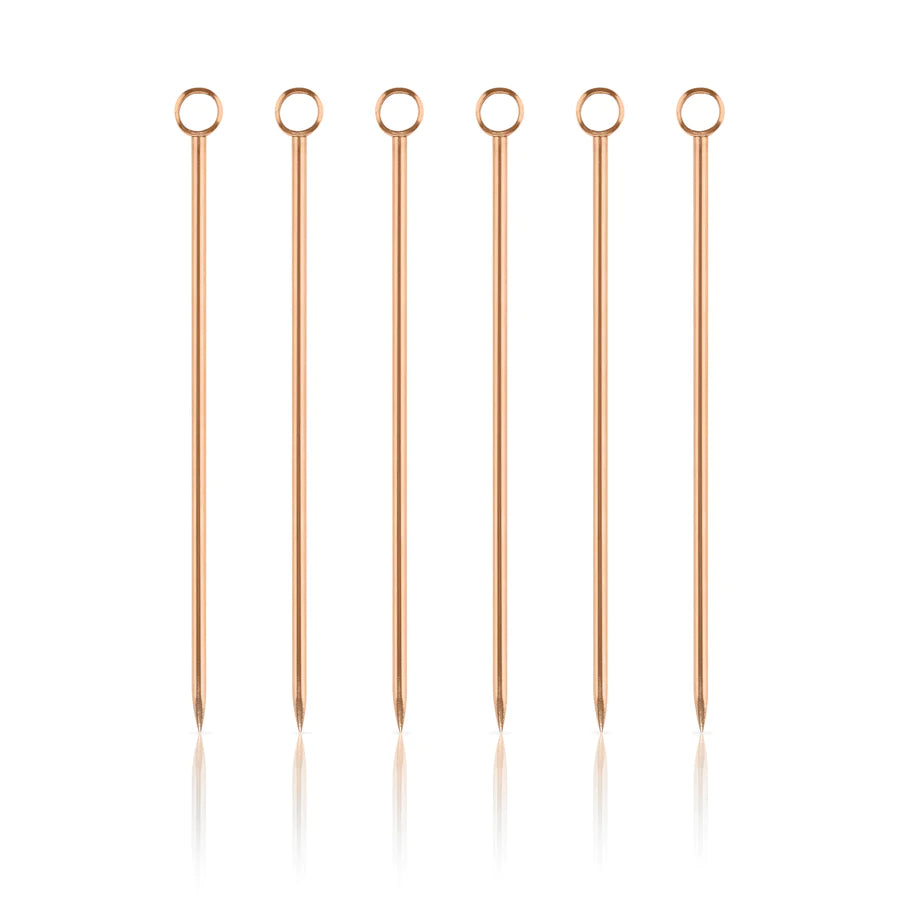 Pick your poison. Each copper cocktail pick in our classic set of six is finished with a small steel ring, ideal for propping an olive in your martini or a brandied cherry in your Manhattan.